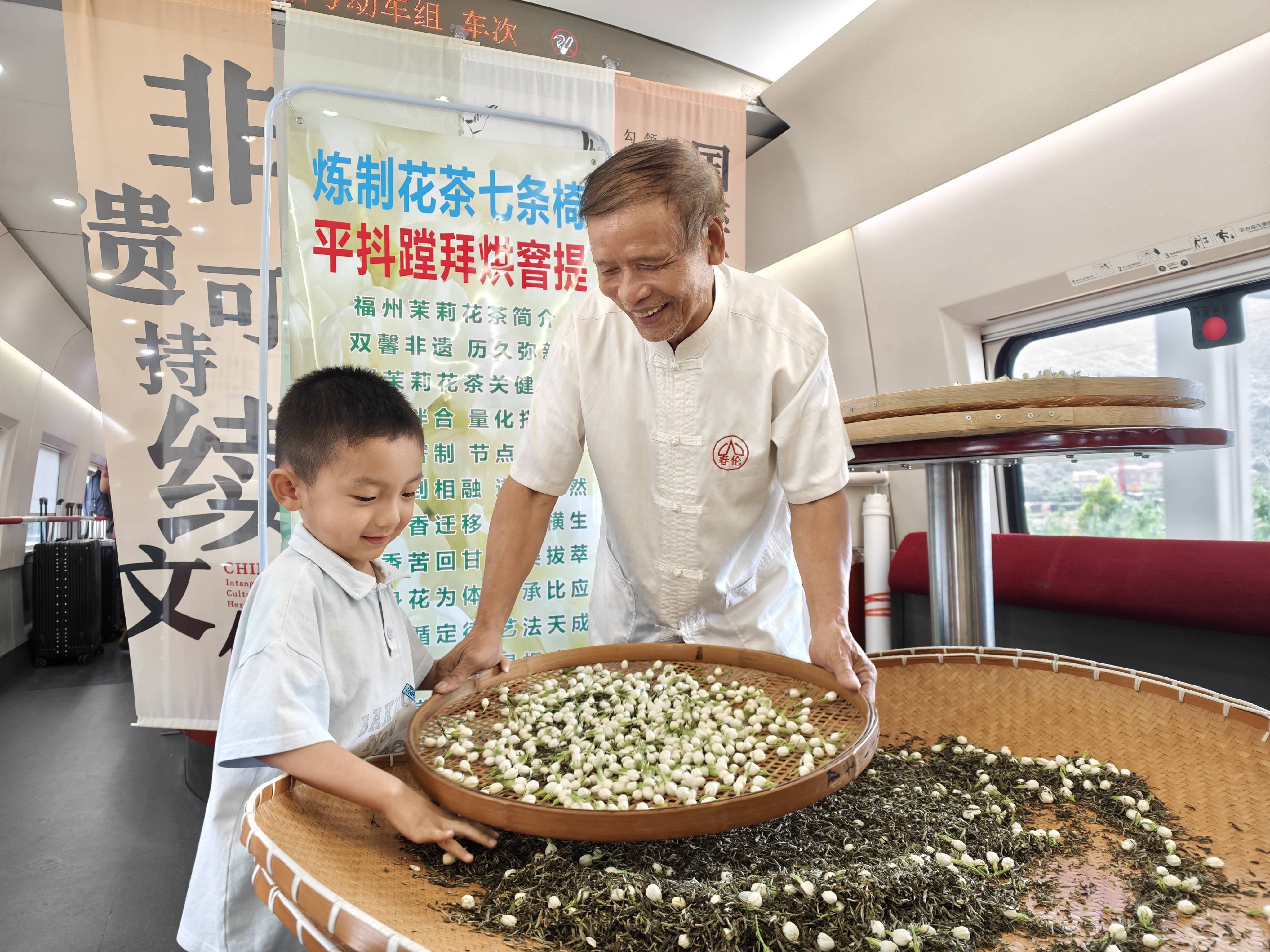 作为茉莉花茶的传统产区,福州市茉莉花茶窨制工艺已入选第一批《福建省省级非遗与旅游融合发展推荐目录》。这项古老的技艺正通过生动鲜活的展示方式,在高速行驶的列车上,赢得越来越多年轻旅客的青睐与认可。